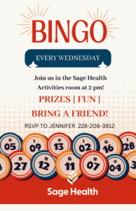 Every Wednesday at 2pm! Join us in the Sage Health Gulfport Activity Room for some fun Bingo games, refreshments, and Prizes! Bring a Friend!